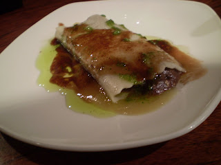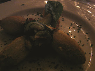 In Logroño, Spain, there is a street, Calle Laurel, which is jam packed with tapas bars and people, which we slowly walked through sampling the fare at many bars each night of our stay. Some specialize in particular tapas, and this one specialized in sepia. I normally don't eat it, but I figured I ought to give it a fair try. Tender, not too chewy sepia, covered in a thin, garlicky alioli and a drizzle of parsley oil on bread. With a small glass of white Rioja it was a fantastic starter in a night full of wonderful little bites.