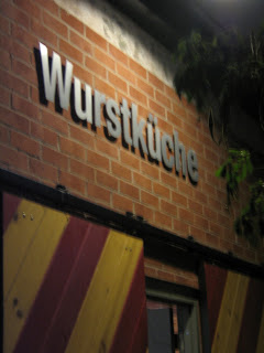 I ventured downtown the other night to check out Wurstkuche, a Father's Office-esque grilled sausage bar. It is in the Arts District of downtown, with a nice view of what I like to call "the backside of downtown." You place your order at the counter, grab your drinks and your number, head down the hall and try to find a seat in the main dining room. Dark, with communal tables, bar and DJ station. They bring out your food pretty quickly, but if you decide to get more food, it is back to the first room and wait in line. The menu is just suasages, choice of a toppings, fries with many dipping sauces, and pleanty of exotic beer on tap. We both opted for the Bockwurst with grilled onlins and sweet peppers, large fries with pesto mayo and blue cheese walnut and bacon dip. We should have just gotten two of the blue cheese, it was so good. Two pints of Pabst Blue Ribbon (I know, not very exotic, but cheap) brought the tab to $22.78. A bargin. I was full but not stuffed. If you are hungry, go ahead and order two sausages. This place is pretty cool, with good food and comfortable atmoshere for lingering and enjoying the night.